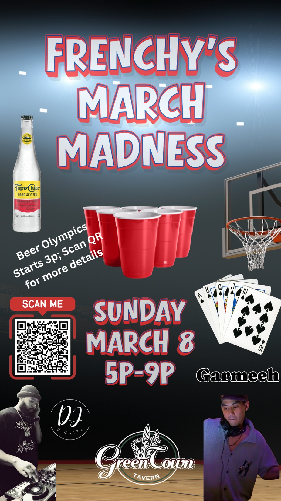 Frenchy's March Madness; Beer Olympics, we are hosting pairs in a series of Drinking Games, and crowing a March Madness Champion. Games being played, Beer Pong, Flip Cup, Bags/Cornhole, Darts. This is a FREE Event you just have to register your team and be on site at 3p.